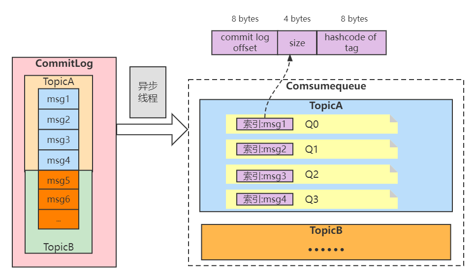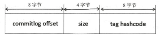 当Commitlog写成功了之后。数据通过ReputMessageService类定时同步到ConsunmeQueue中,写入Consume Queue的内容是定长的,固定是20个Bytes(offset 8个、size 4个、Hashcode of Tag 8个)。