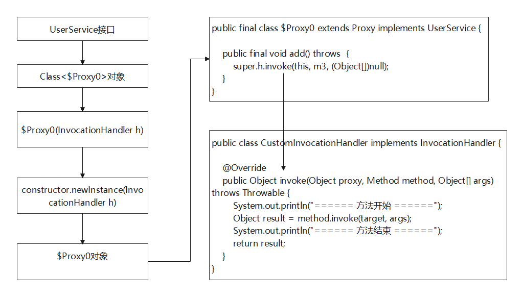 CustomInvocationHandler实现InvocationHandler接口。Proxy.newProxyInstance构建实例对象。// UserService接口