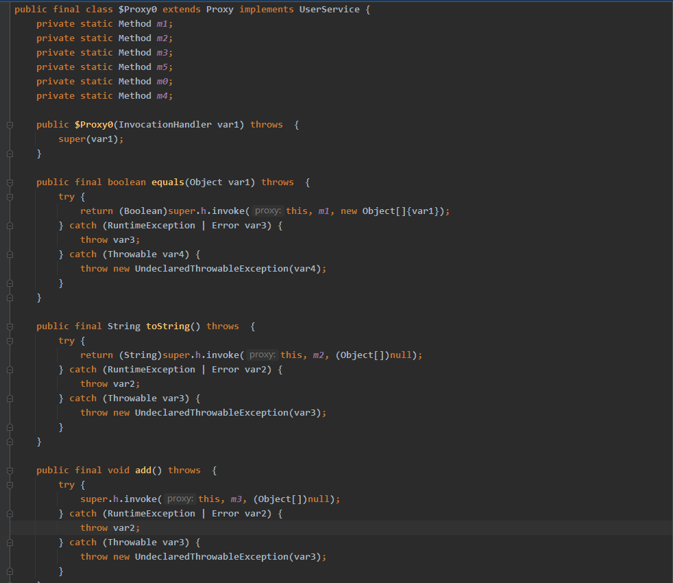 可以看到生成的代理类$Proxy0继承自Proxy类,并实现了UserService接口,并且在add()方法中通过其父类Proxy中维护的InvocationHandler对象调用invoke()方法,这也就成功的解释了前面调用userService.add()方法,会回调到invoke()方法。