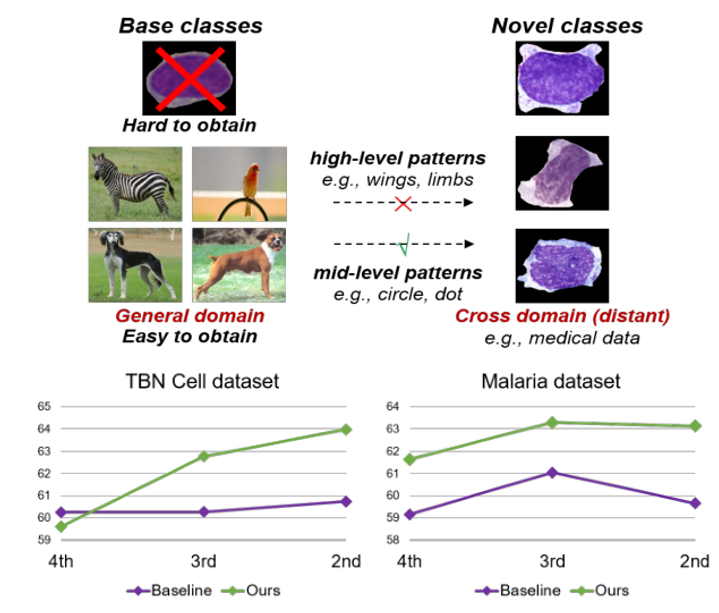 上图:一般域中的样本很容易获得,而在可能远离一般域的特殊域(例如医疗数据)中可能很难获得。为了将知识从一般域中易于获得的基类转移到遥远领域中的新类(跨领域小样本识别的一个具有挑战性的子集),我们重新研究了比高级模式(eg.翅膀、四肢)更具可转移性的中级模式(eg.圆圈、点)。