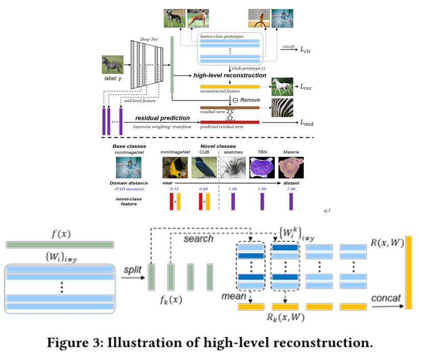 上图:首先提取每个基类样本(例如,斑马)的特征,骨干网络通过分类损失进行训练。然后,对于每个样本,作者设计使用其他类别(例如狗、鸟、人)的高级模式来重建提取的特征(高级重建),并从提取的特征中删除重建的特征(例如,没有条纹的斑马,可能是白马),输出判别残差特征(例如条纹),包含适用于中级特征学习的该样本的判别信息。最后,作者约束中间层特征来预测这种判别残差特征,从而推动中级层的特征具有判别性。