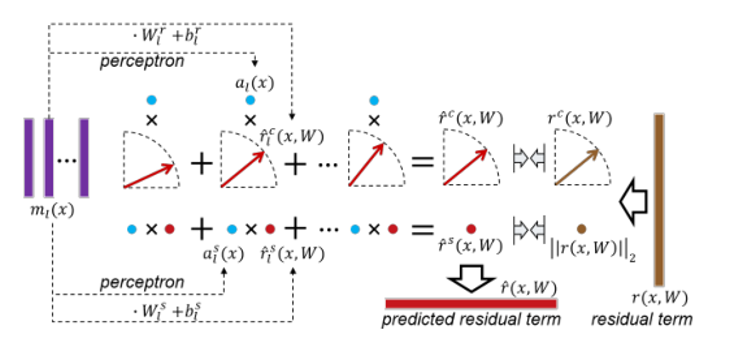 每个圆代表一个标量,扇形区域中的每个箭头表示一个L2归一化向量,蓝色圆圈表示层权重。由于向量可以分解为两个方向(L2归一化向量)和长度(L2范数),我们分别预测残差项的方向rc(x,W),即棕色箭头和长度,即棕色圆圈。