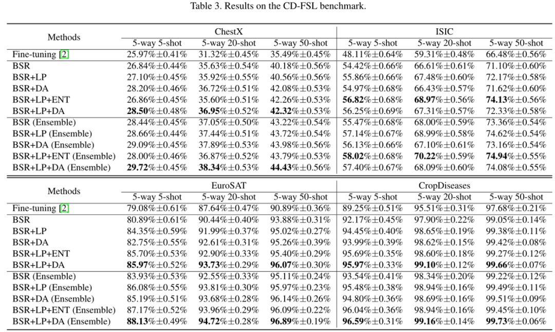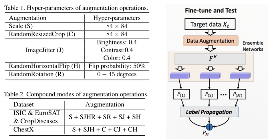 利用数据增强(DA)策略,补充支持集,使模型在更多的变化中学习。特别地,作者使用一些操作的组合,如图像缩放,随机裁剪,随机翻转,随机旋转和颜色抖动为每个图像生成一些变体。可以对增强支持集进行微调。同样的增强也可以用于查询集,其中可以生成每个图像的多个变体,以共享相同的标签。因此,对每幅图像的预测结果可以通过平均同一幅图像的所有增强变量的预测结果来确定。