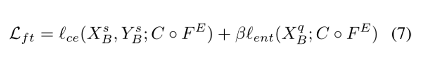 将这一项加入到支持集的每批(XsB, Y sB)上原有的交叉熵损失中,形成一个转导性的微调损失函数: