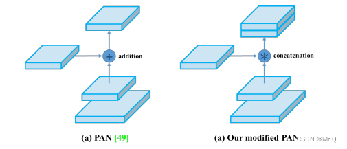 PAN, Path Aggregation Network(路径聚合网络)网络结构如下。左边和右边的PAN区别在于不同尺度特征融合方式,左边是相加、右边是concat方式。