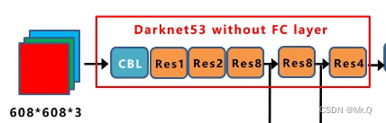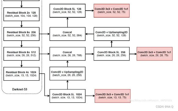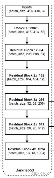 (3)如果输入的是416x416,则输出三个尺度:52x52x256, 26x26x512, 13x13x1024.