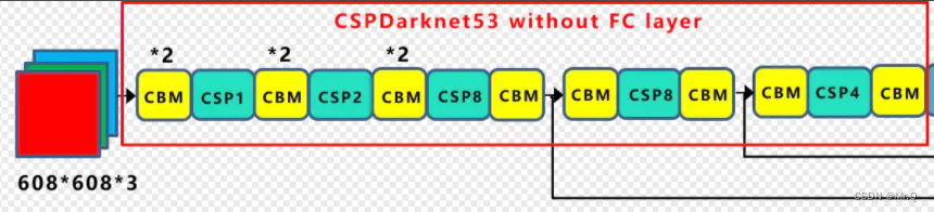 (2)而CSPDarknet53则是在每个卷积层CBM后追加CSP blocks. 如下图所示。