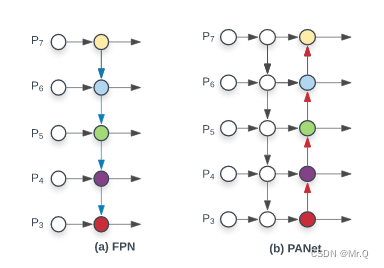 不同点:连接方式不同,FPN是自顶向下的路径,从而形成一个单一的特征金字塔。而PAN则包含了自顶向下和自下而上的路径,路径更多,以实现不同分辨率的特征融合。