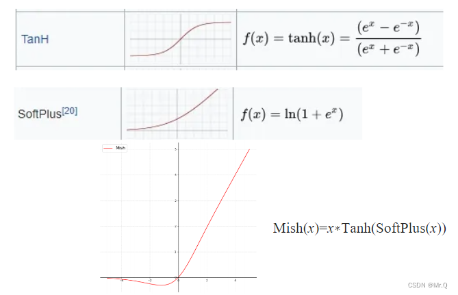 非单调的Mish激活函数是在单调递增的softplus激活函数基础上,再外包了一个单调递增的tanh激活函数。如下所示。