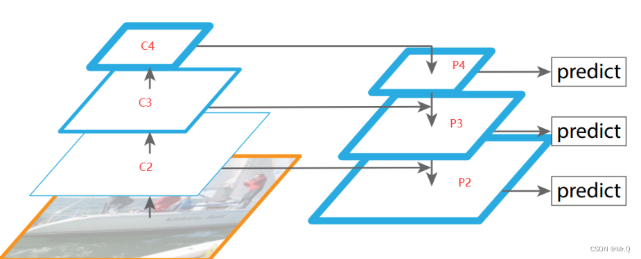 FPN,Feature Pyramid Network结构示意图如下。FPN结构通过上采样不断的融合不同尺度的特征,得到多尺度的输出,使得网络能够预测多尺度目标。