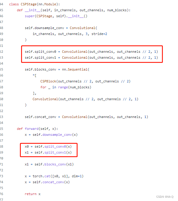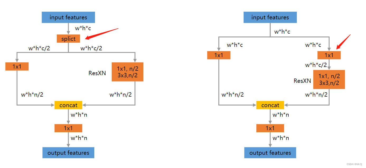 在进入多个残差块之前,左右两种方式都将通道数减半,坐边是简单的splict函数直接拆分通道,右边是通过1x1的卷积。通道数减半后,再进入残差块,计算量就少了。