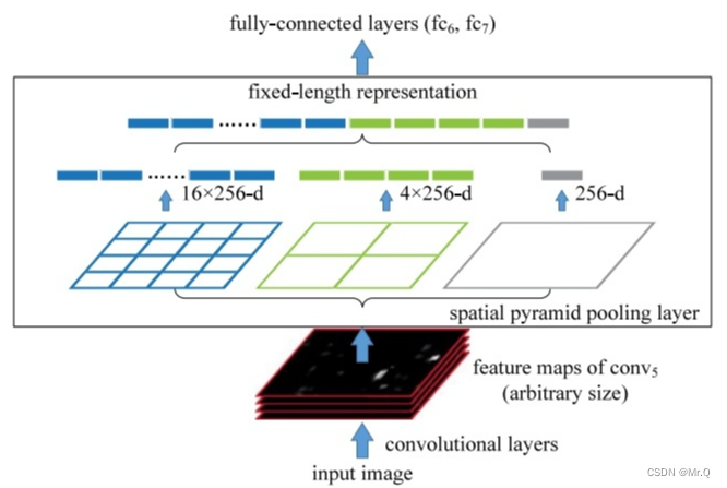 如下图所示,每个网络输出一个值,有256个通道,则最大池化后,输出的向量维度是固定的,左边的4x4个网格,输出向量维度是16x256,中间是2x2个网格,输出向量维度是4x256,右边是1x1的网格,输出向量维度是256. 最后的拼接在一起,所以最后的向量维度是固定的。方便分类网络兼容多尺度输入。