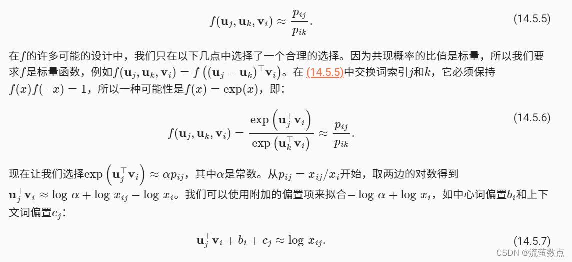 由此可见,共现概率的比值能够直观地表达词与词之间的关系。因此,我们可以设计三个词向量的函数来拟合这个比值。对于共现概率的比值,其中