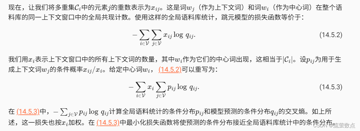 通过对 (14.5.7)的加权平方误差的度量,得到了 (14.5.4)的GloVe损失函数。