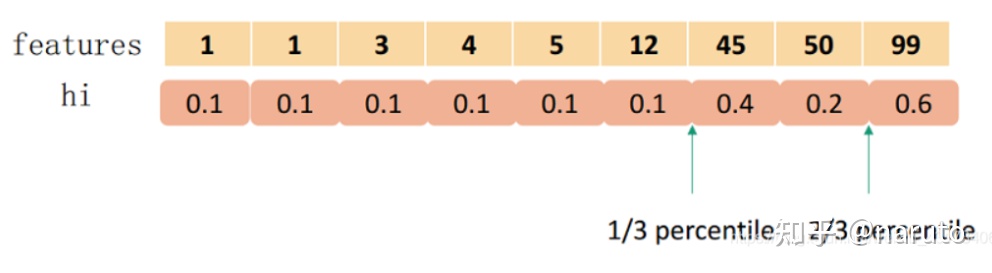 式子中分子是x小于z得所有样本对应得h之和(即小于z得样本加权和,权重为h),分母为所有样本得加权和。该式子表达了第k个特征小于z得样本比例,和分位数相似,不过这里是按照二阶梯度进行累计。