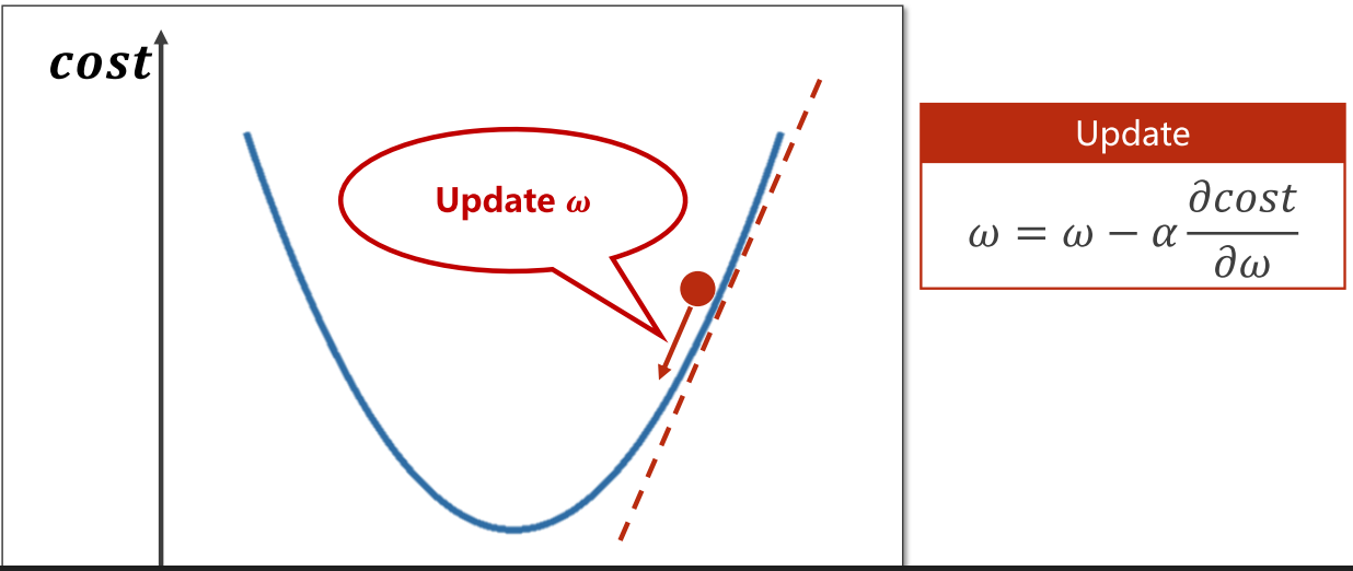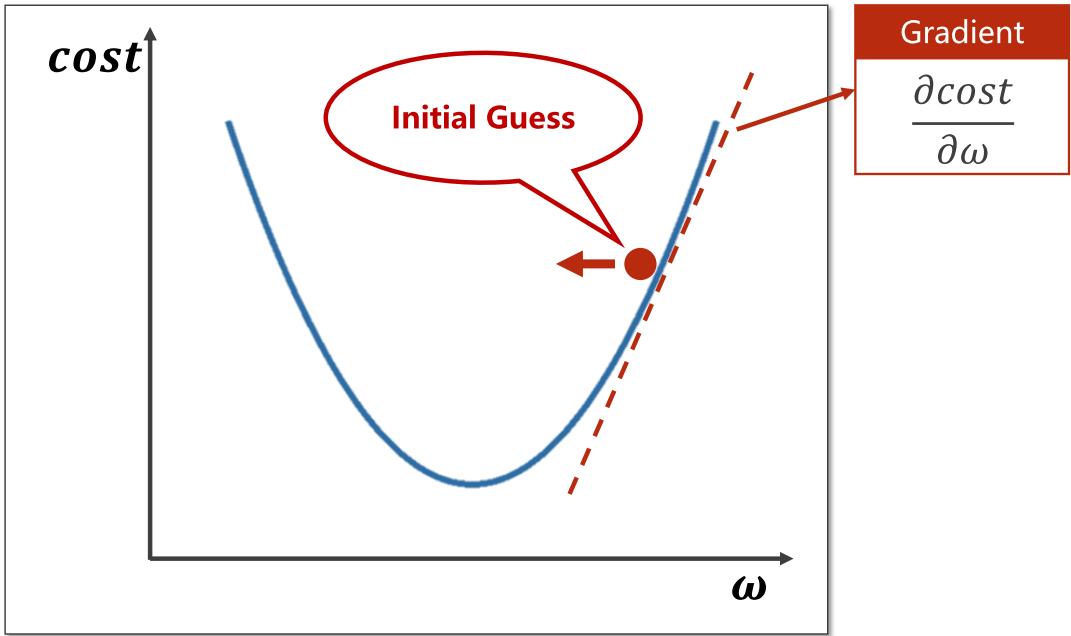 如何让权值点向左还是向右移动呢?此时我们需要计算当前点的梯度(Gradient),也就是用成本函数对权重进行求导,如果梯度<0,则向函数值递减方向移动;梯度>0,则向函数值递增方向移动。