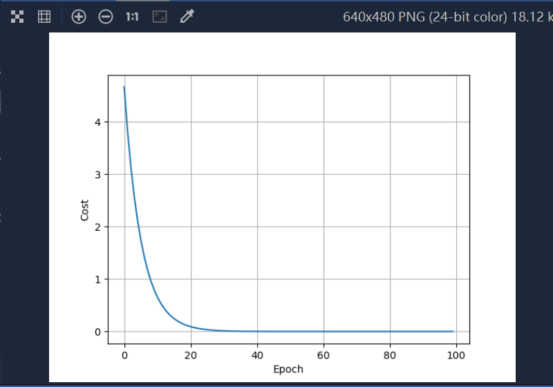 for epoch in range(100): # 进行100轮训练cost_val = cost(x_data, y_data)grad_val = gradient(x_data, y_data)w -= 0.01 * grad_val # 使用梯度下降法更新权重,0.01表示学习率print('Epoch:', epoch, 'w=%.2f' % w, 'loss=%.2f' % cost_val)cost_list.append(cost_val)epoch_list.append(epoch)