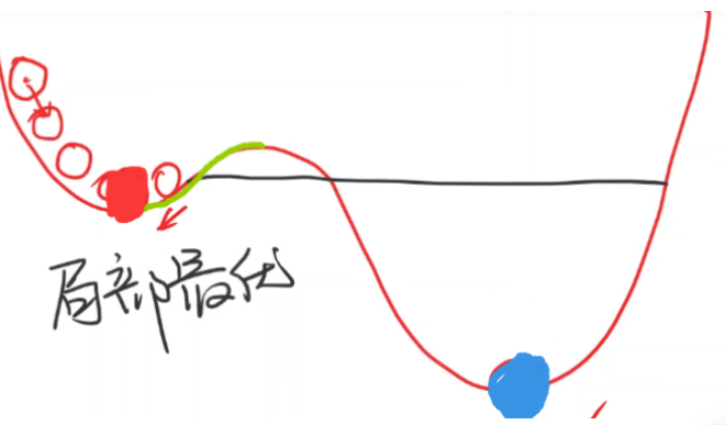 这就是批量梯度下降算法,本质上是一个贪心算法(Greedy Algorithm)。不过该算法有局限性,比如当前的预测值正好位于下图绿线处,因为再往右移动会梯度会发生变化,使得程序直接终止,于是误将红的点作为最优