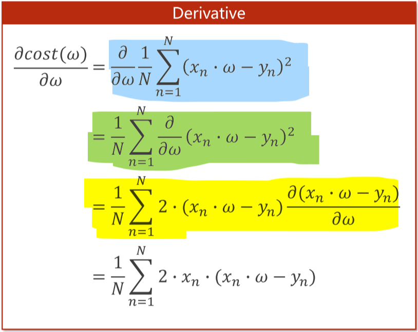 蓝色处,因为cost=MSE,所以直接代入上一节课的MSE公式,然后对求导。