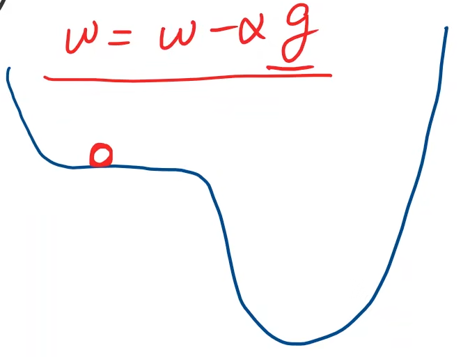 在实际训练中,往往很难陷入局部最优点,而最需要解决的问题是鞍点(Saddle Point),鞍点是机器学习和数学中的一个概念,它指的是一个特殊的局部极小值,在某些方向上是极小值,但在其他方向上是极大值。在一元函数中,梯度=0的点就是鞍点。比如下图中,红色小球所处的位置就在鞍点,此时梯度为零,会导致更新函数无法更新(因为梯度=0,=