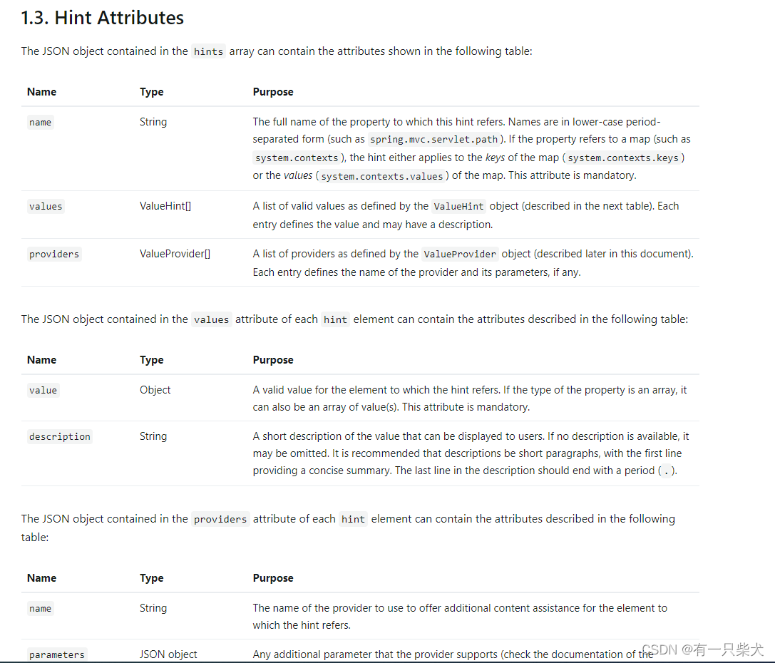 }properties:为设置的提示属性,name为属性名称,type为属性类型,defaultValue为该属性默认值,description为属性描述。