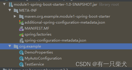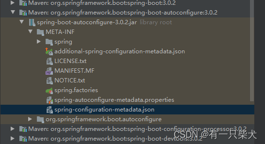 其实IDE是通过读取配置信息的元数据而实现自动提示的。Springboot的元数据就在目录META-INF下。通过starter部分结构,我们可以看到如下: