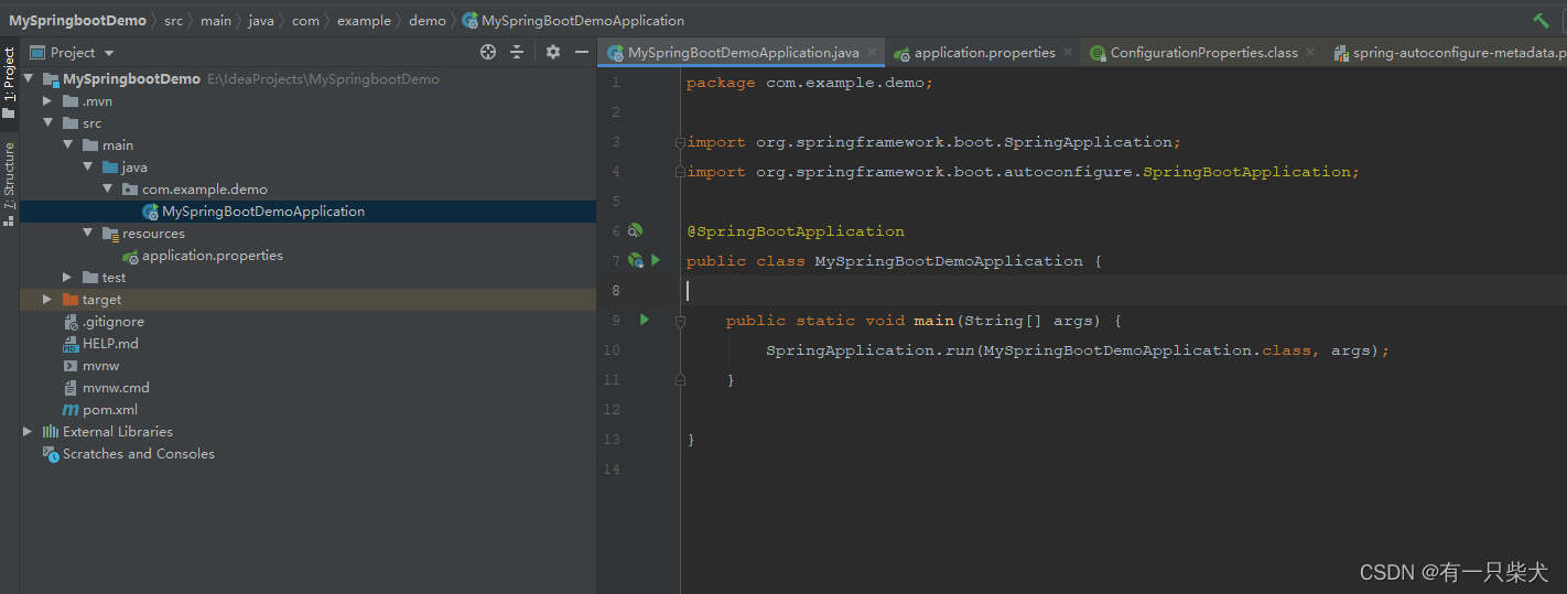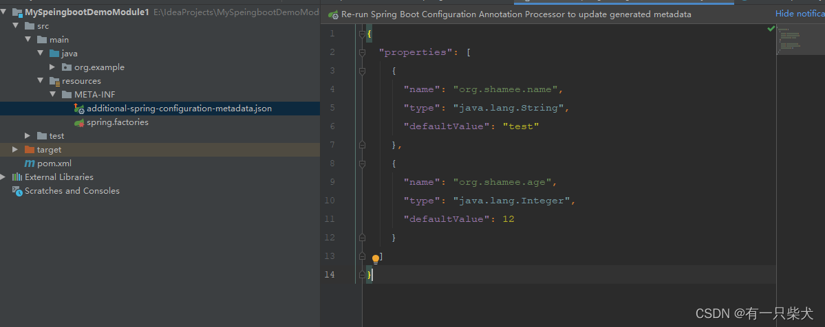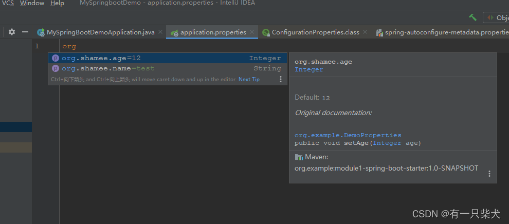org.example.MyAutoConfiguration到此,一个简单的starter模块就已创建完毕,但是此时,如果直接使用,IDE是无法自动提示的。这里我们期望IDE帮我们自动提示DemoProperties中的两个属性,org.shamee.name和org.shamee.age。