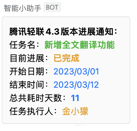 最后,我们就可以实现,项目有进展时会自动发送以下消息。