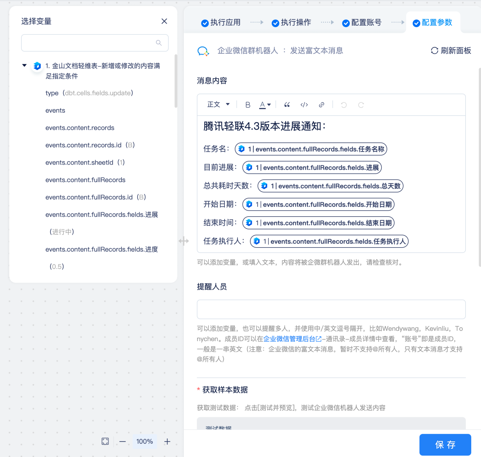 我们按照页面提示,使用【企业微信群机器人-发送富文本消息】,根据第一个节点获取到的变量,输出我们需要的内容和变量。
