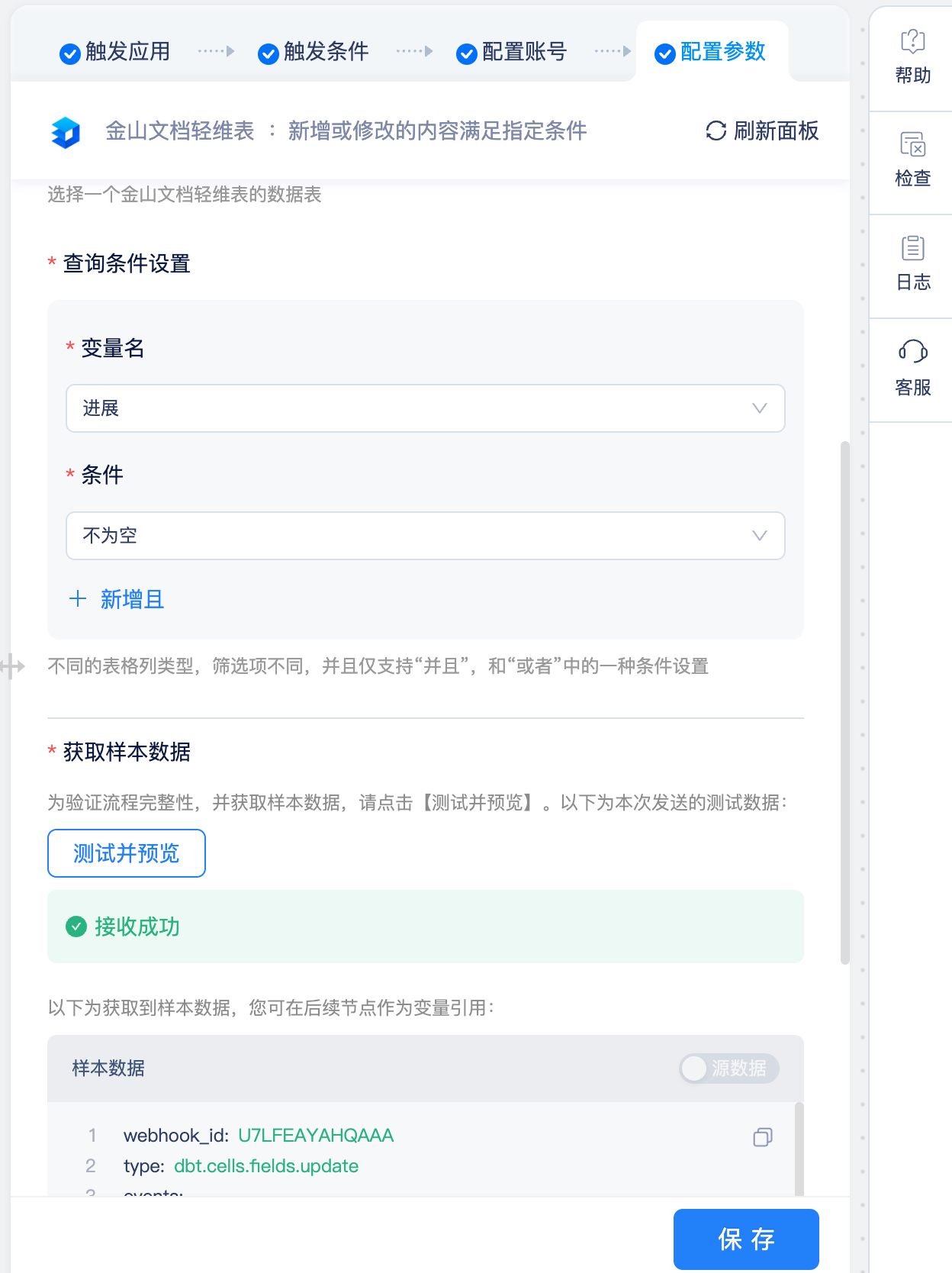 触发节点选择【金山文档轻维表-新增或修改的内容满足指定条件】。这里我们将条件设置为“进展不为空”,主要是为了监控到每一次的变动。我们在实际使用时,也可以设置为“进展=已完成”等状态。