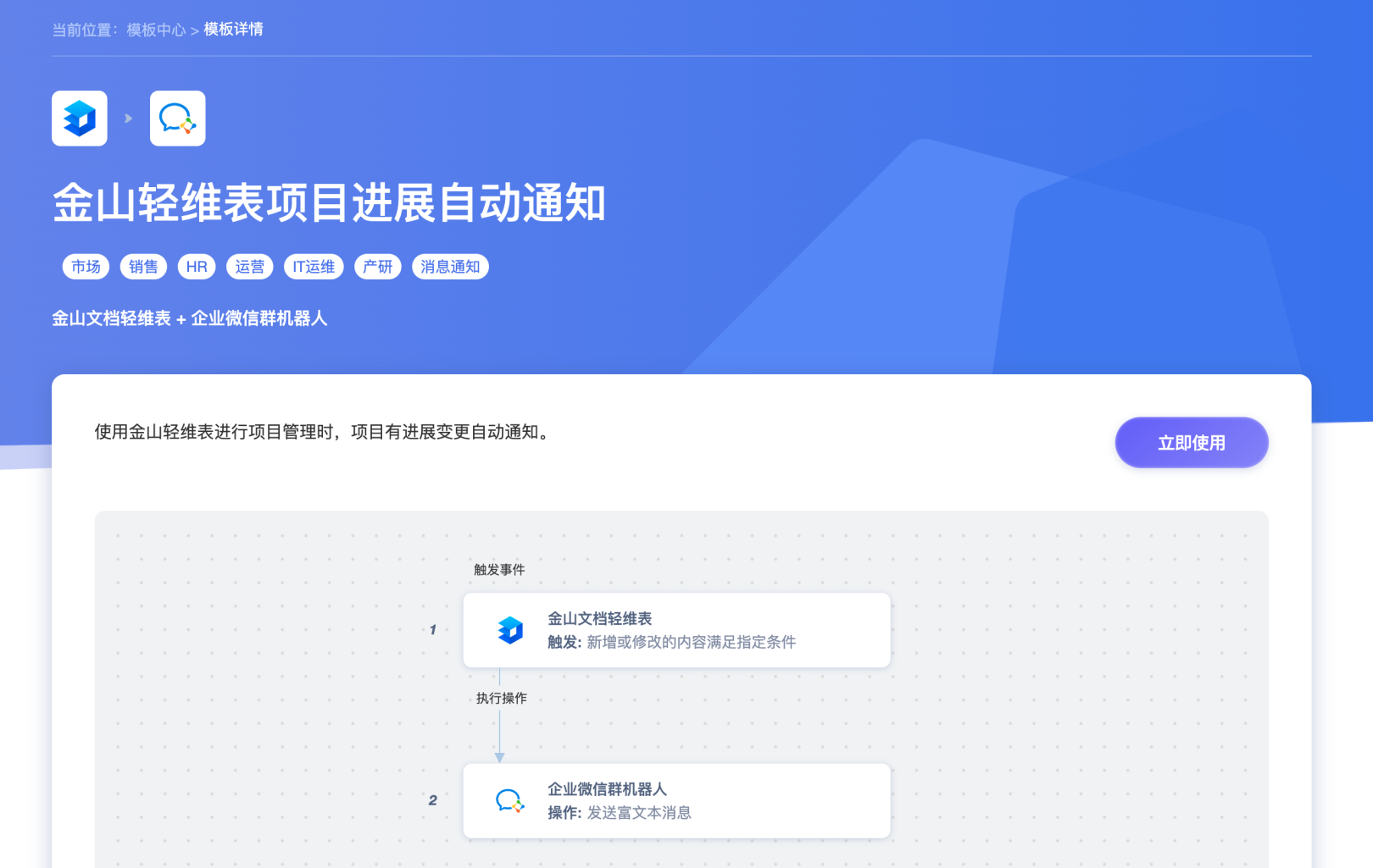 然后我们进入腾讯云HiFlow,选择【项目进展自动通知】模板,点击「立即使用」。