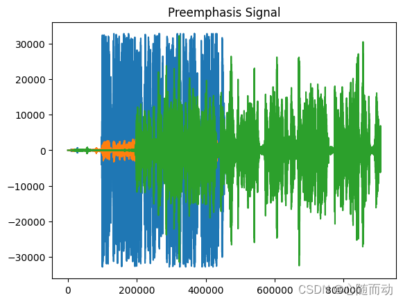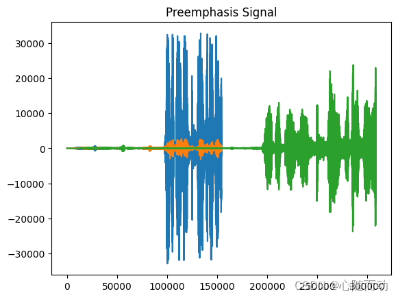 import numpy as np import matplotlib.pyplot as plt from python_speech_features.sigproc import * from python_speech_features import * from scipy.fftpack import dct import scipy.io.wavfile as wav sample_rate,signal=wav.read('./test.wav') #保留语音的前3.5秒 signal=signal[0:int(3.5*sample_rate)] #信号预加重 emphasized_signal=preemphasis(signal,coeff=0.95) #显示信号 plt.plot(signal) plt.title("Original Signal") plt.plot(emphasized_signal) plt.title("Preemphasis Signal") plt.show()