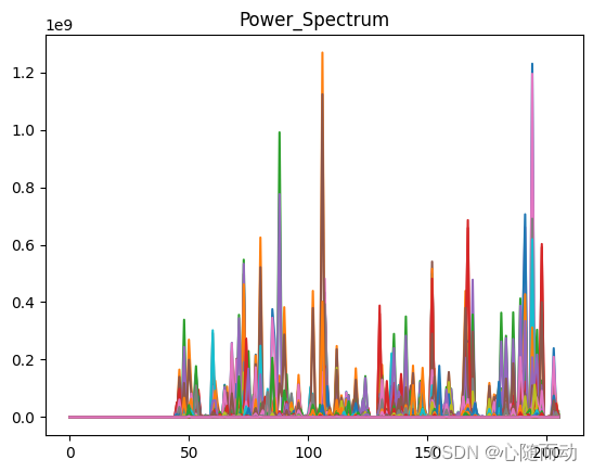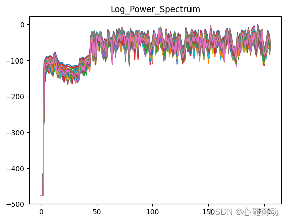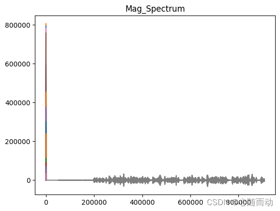 NFFT=512 mag_frames=np.absolute(np.fft.rfft(frames,NFFT)) pow_frames=((1.0/NFFT)*((mag_frames)**2)) log_pow_frames=logpowspec(pow_frames,NFFT,norm=1) #保留语音的前3.5秒 #signal=signal[0:int(3.5*sample_rate)] #信号预加重 #emphasized_signal=preemphasis(signal,coeff=0.95) #显示信号 plt.plot(mag_frames) plt.title("Mag_Spectrum") plt.plot(emphasized_signal) plt.show() plt.plot(pow_frames) plt.title("Power_Spectrum") plt.show() plt.plot(pow_frames) plt.title("Log_Power_Spectrum") plt.show()