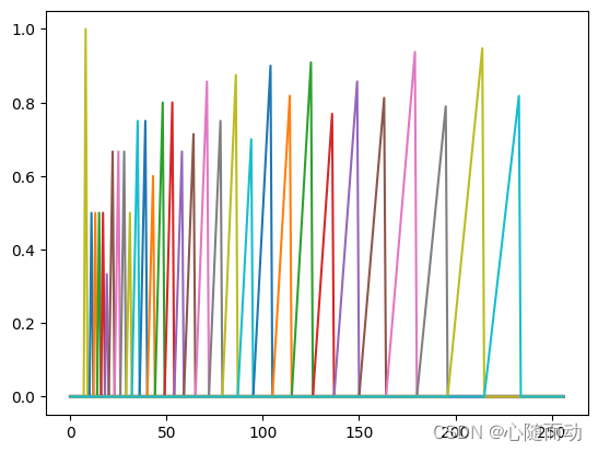 low_freq_MEL=0 #将频率转换为梅尔刻度 nfilt=40 #窗的数目 #计算m=2595*log10(1+f/700) high_freq_mel=(2595*np.log10(1+(sample_rate/2)/700)) mel_points=np.linspace(low_freq_MEL,high_freq_mel,nfilt+2) #梅尔刻度的均匀分布 #计算f=700(10**(m/2595)-1) hz_points=(700*(10**(mel_points/2595)-1)) bin=np.floor((NFFT+1)*hz_points/sample_rate) fbank=np.zeros((nfilt,int(np.floor(NFFT/2+1)))) #计算三角形滤波器频率响应 for m in range(1,nfilt+1):f_m_minus=int(bin[m-1]) #三角形滤波器左边频率f(m-1)f_m=int(bin[m]) #三角形滤波器中间频率fmf_m_plus=int(bin[m+1]) #三角形滤波器右边频率f(m-1)for k in range(f_m_minus,f_m):fbank[m-1,k]=(k-bin[m-1])/(bin[m+1]-bin[m]) plt.plot(fbank.T) plt.show()