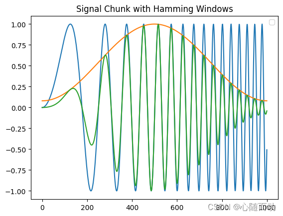 import numpy as np import matplotlib.pyplot as plt import scipy x=np.linspace(0,10,1000) originWav=np.sin(x**2) #示例原信号 win=scipy.hamming(1000) #定义一个窗函数,这里使用的汉明窗 winFrame=originWav*win #结果可视化 plt.title("Signal Chunk with Hamming Windows") plt.plot(originWav) plt.plot(win) plt.plot(winFrame) plt.legend() plt.show()