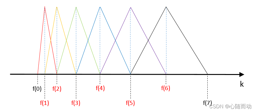 三角形滤波器有两个主要功能,其一,对频谱进行平滑并消除谐波的作用,突显原先语音的共振峰;其二,用以降低运算量。如图所示的滤波器组中的每个滤波器在中心频率处响应为1,并朝着0线性减少,直至达到响应为0的两个相邻滤波器的中心频率。