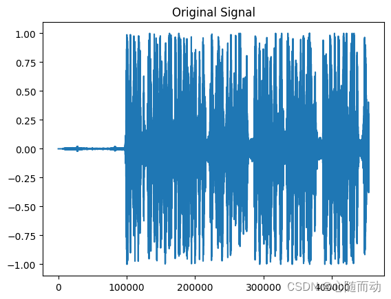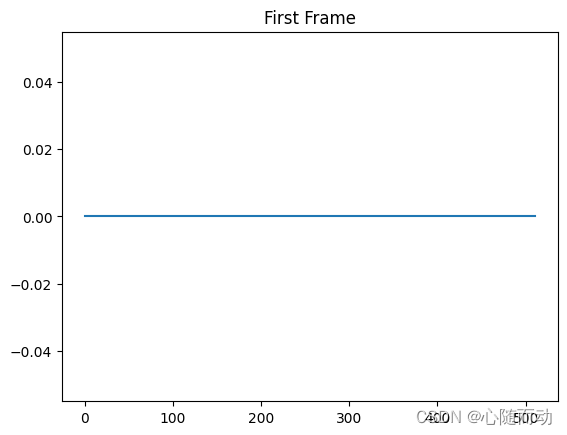 #读取指定音频文件 import matplotlib.pyplot as plt import numpy as np import wave #导入波形处理工具包 import os import soundfile def audioSignalFrame(signal,nw,inc):'''signal:原始音频信号nw:每一帧的长度inc:相邻帧的间隔'''#信号总长度signal_length=len(signal)#若信号长度小于一个帧的长度,则帧数定义为1if signal_length<=nw:nf=1else:nf=int(np.ceil((1.0*signal_length-nw+inc)/inc))#所有帧加起来的总的铺平的长度pad_length=int((nf-1)*inc+nw)#长度不够时,使用0填补,类似于FFT中的扩充数组长度zeros=np.zeros((pad_length-signal_length,))#填补后的信号pad_signal=np.concatenate((signal,zeros))#相当于对所有帧的时间点进行抽取,得到nf*nw的长度的矩阵indices=np.tile(np.arange(0,nw),(nf,1))+np.tile(np.arange(0,nf*inc,inc),(nw,1)).T#将indices转化为矩阵indices=np.array(indices,dtype=np.int32)#得到帧信号frames=pad_signal[indices]#窗函数,这里默认取1return frames def readSignalWave(filename):f=wave.open(filename,'rb')params=f.getparams()nchannels,sampwidth,frammerate,nframes=params[:4]#读取音频,字符串格式strData=f.readframes(nframes)#将字符串转化为intwaveData=np.fromstring(strData,dtype=np.int16)f.close()#信号幅值归一化waveData=waveData*1.0/(max(abs(waveData)))waveData=np.reshape(waveData,[nframes,nchannels]).Treturn waveData if __name__=='__main__':filepath="./test.wav"#dirname=os.listdir(filepath)#filename=filepath+dirname[3]data=readSignalWave(filepath)#初始化每帧长度及帧间隔nw=512inc=128Frame=audioSignalFrame(data[0],nw,inc)#显示原始信号plt.plot(data[0])plt.title("Original Signal")plt.show()#显示第一帧信号plt.plot(Frame[0])plt.title("First Frame")plt.show()