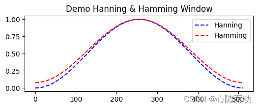 import matplotlib.pyplot as plt import scipy #信号处理工具包 plt.figure(figsize=(6,2)) plt.plot(scipy.hanning(512),"b--",label="Hanning") #绘制汉宁窗 plt.plot(scipy.hamming(512),"r--",label="Hamming") #绘制汉明窗 plt.title("Demo Hanning & Hamming Window") plt.legend() plt.show()