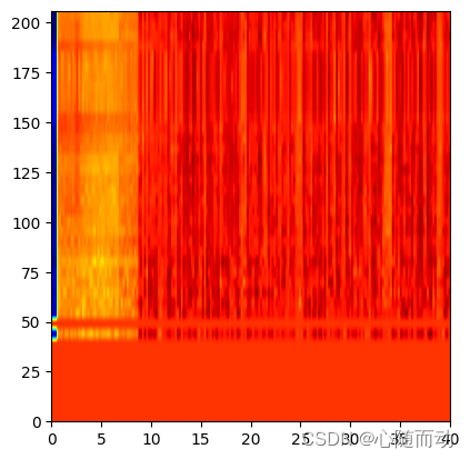 filter_banks-=(np.mean(filter_banks,axis=0)+1e-8) plt.imshow(np.flipud(filter_banks.T),cmap=plt.cm.jet,aspect=0.2,extent=[0,filter_banks.shape[1],0,filter_banks.shape[0]]) plt.show()