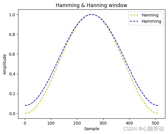 import numpy as np import matplotlib.pyplot as plt hanWing=np.hanning(512)#定义汉宁窗 hamWin=np.hamming(512) #定义汉明窗 plt.plot(hanWing,'y--',label="Hanning") plt.plot(hamWin,'b--',label="Hamming") plt.title("Hamming & Hanning window") plt.ylabel("Amplitude") plt.xlabel("Sample") plt.legend() plt.show()