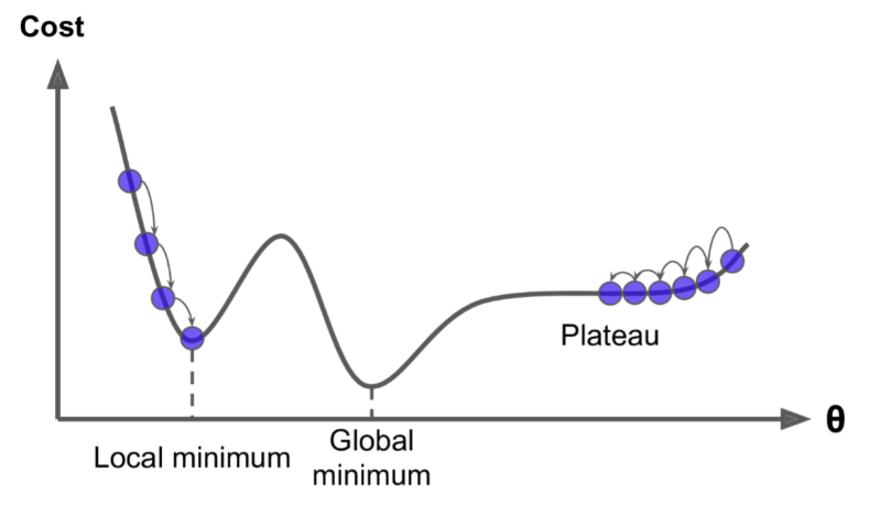 • 若随机初始化,算法从左侧起步,那么会收敛到一个局部最小值,而不是全局最小值;