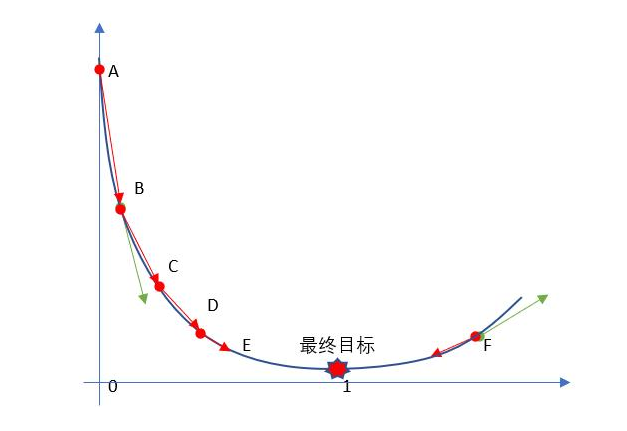 根据我们上面讲的梯度下降公式,我们知道η是学习率,设置大的学习率目标值每次调整的幅度就大,设置小的学习率 目标值每次调整的幅度就小,然而如果步子迈的太大也会有问题,俗话说步子大了容易扯着蛋!学习率大,可能一下子迈过了,到另一边去了(从曲线左半边跳到右半边),继续梯度下降又迈回来, 使得来来回回震荡。步子太小呢,就像蜗牛一步步往前挪,也会使得整体迭代次数增加。