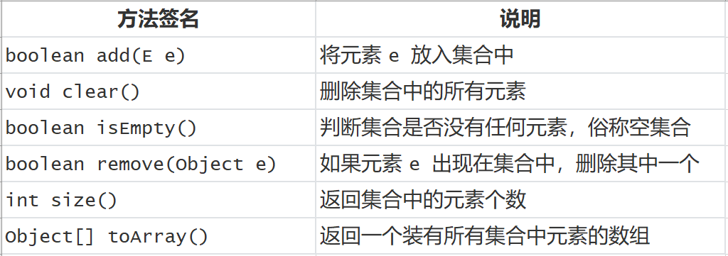 import java.util.Collection;public class Test1 {public static void main(String[] args) {Collection collection = new ArrayList<>();collection.add("h");collection.add("e");collection.add("l");collection.add("l");collection.add("o");for (String str : collection) {System.out.print(str);}System.out.println();System.out.println(collection.size());collection.clear();System.out.println(collection.size());}