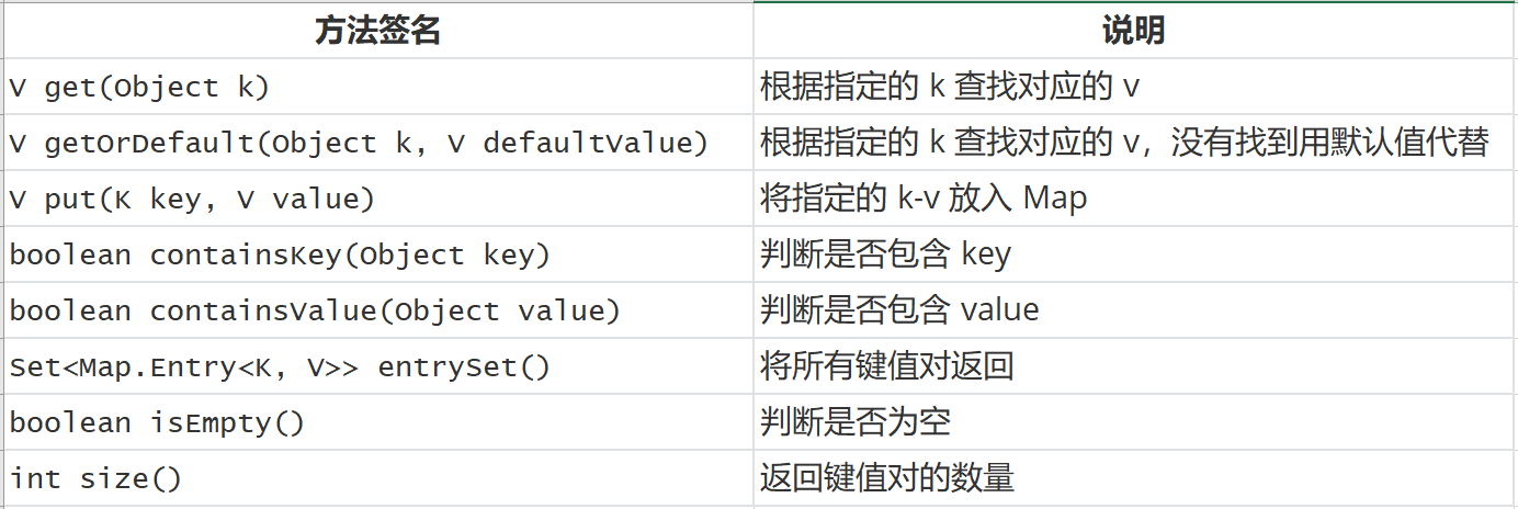 import java.util.Map;public class Test2 {public static void main(String[] args) {Map map = new HashMap<>();System.out.println(map.size());System.out.println(map.isEmpty());System.out.println(map.get("罗贯中"));System.out.println(map.getOrDefault("罗贯中", "空"));System.out.println(map.containsKey("罗贯中"));System.out.println(map.containsKey("曹雪芹"));map.put("罗贯中", "三国演义");map.put("曹雪芹", "红楼梦");System.out.println(map.size());System.out.println(map.isEmpty());System.out.println(map.get("罗贯中"));System.out.println(map.get("曹雪芹"));System.out.println(map.containsValue("红楼梦"));for (Map.Entry entry : map.entrySet()) {System.out.print(entry.getKey() + " ");System.out.print(entry.getValue());System.out.println();}}