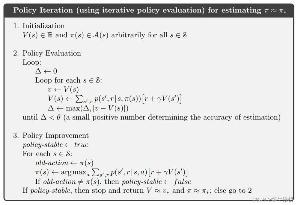 每一轮(each iteration)的策略评估是以是上一轮结束后得到的策略(policy)的值函数(value function)为初始值的。策略迭代的算法流程如下所示: