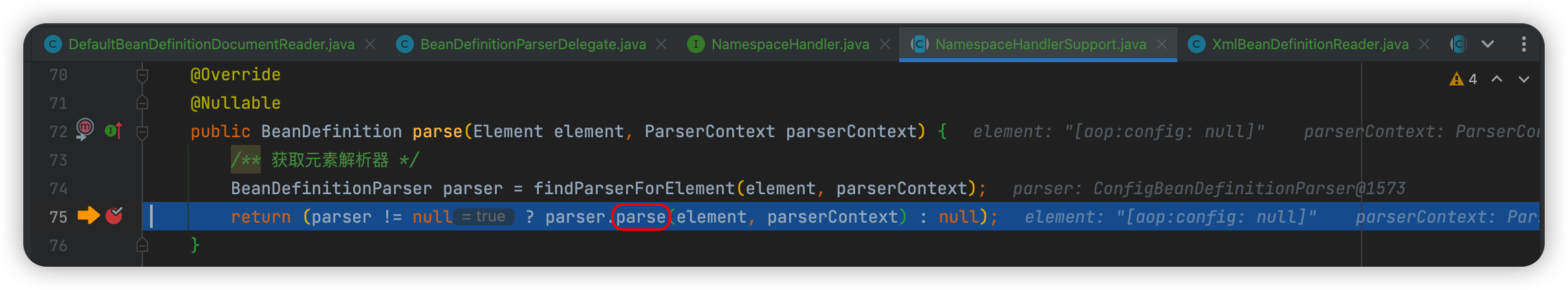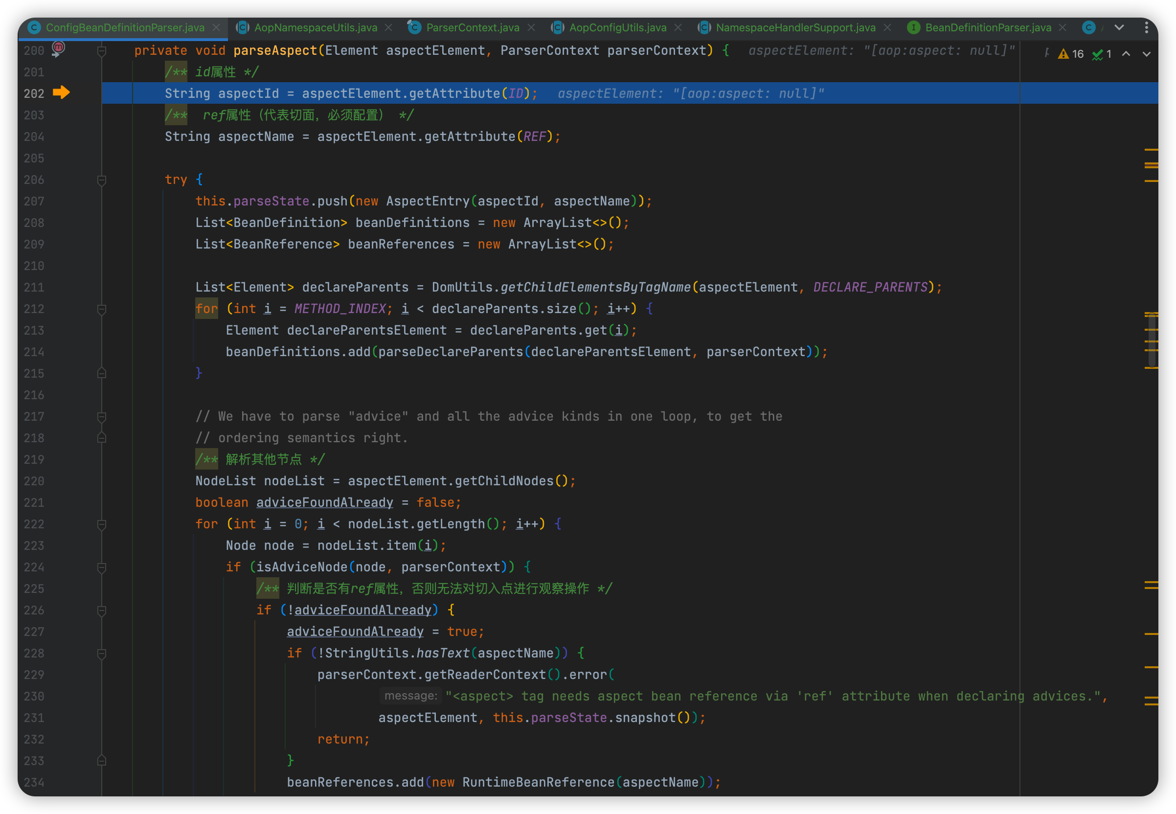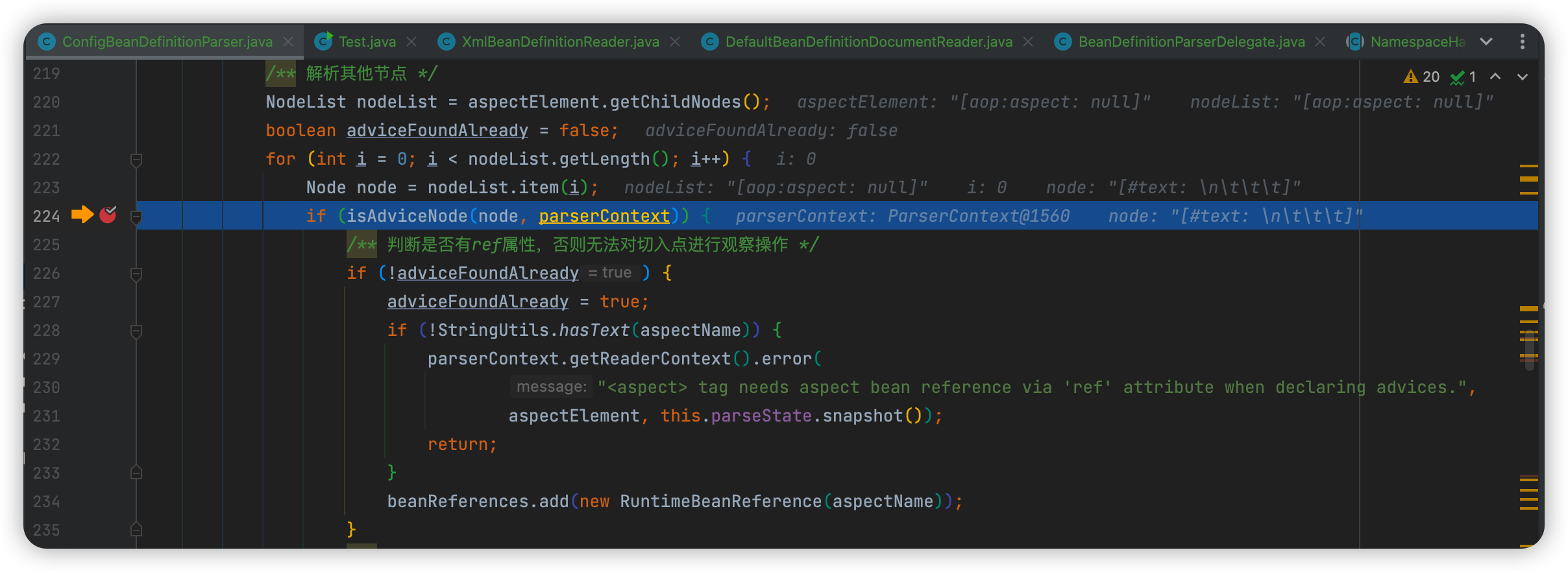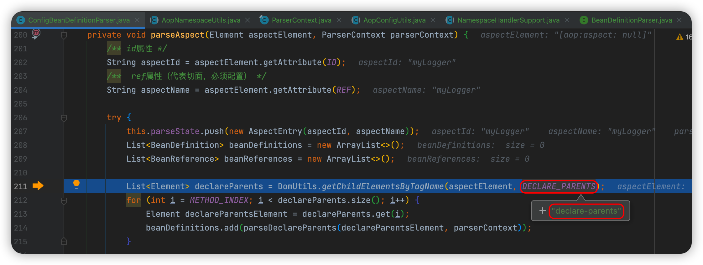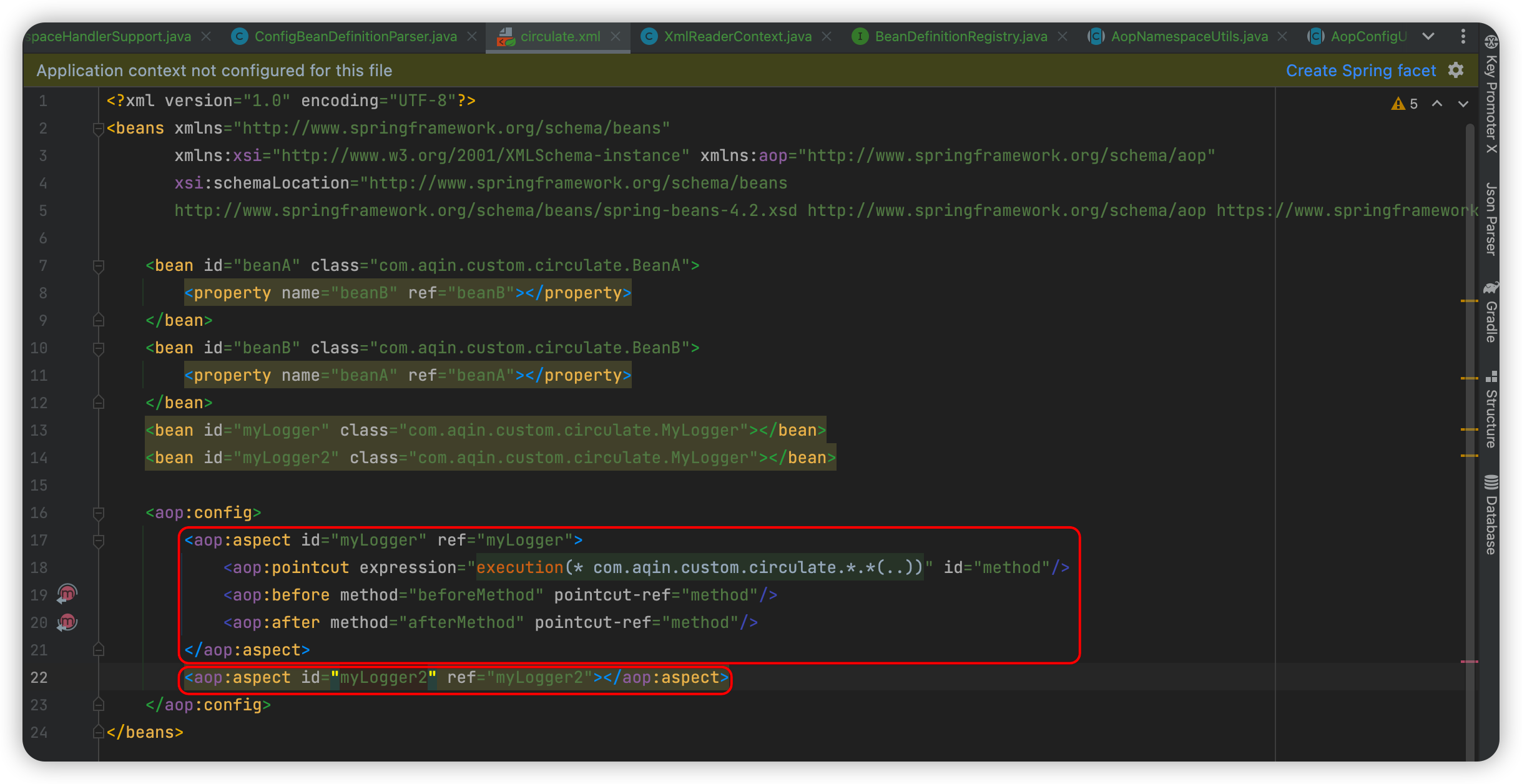 循环结束后,返回到parse()方法中,由于我在XML配置文件(如下图)中加了两个aspect标签🏷️,所以childElts里有两个Element,于是会再按上面👆得大致流程再执行一遍