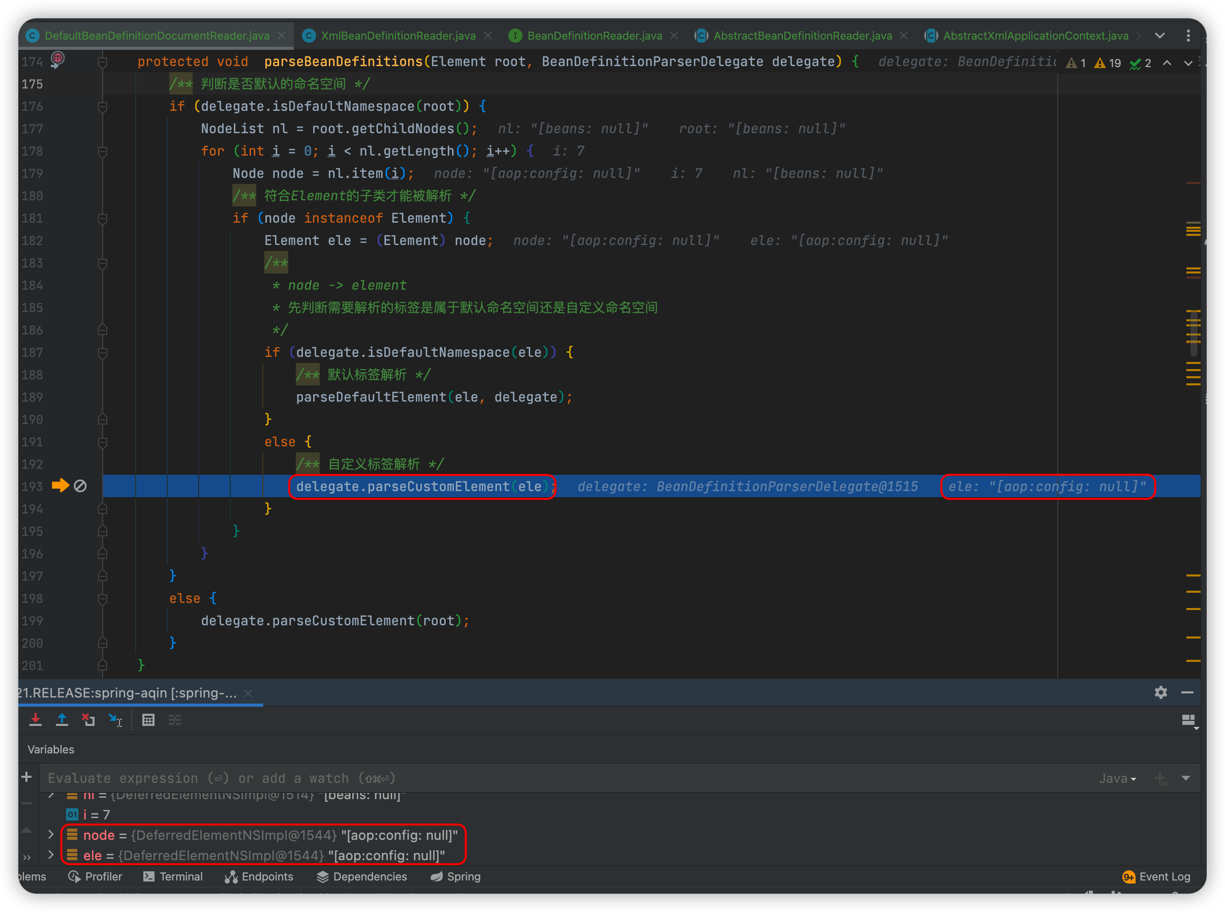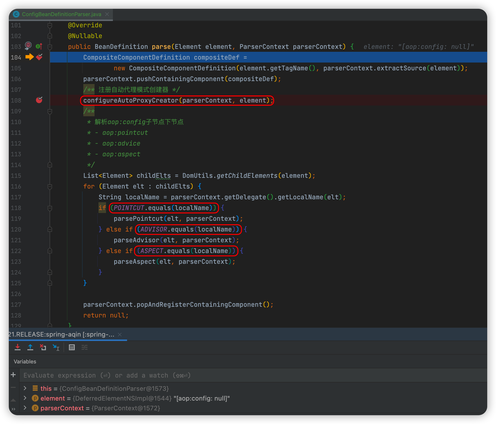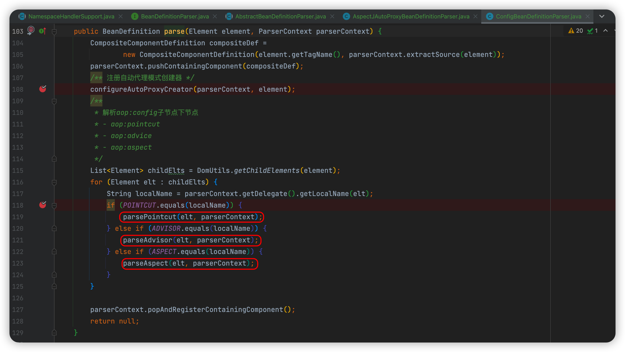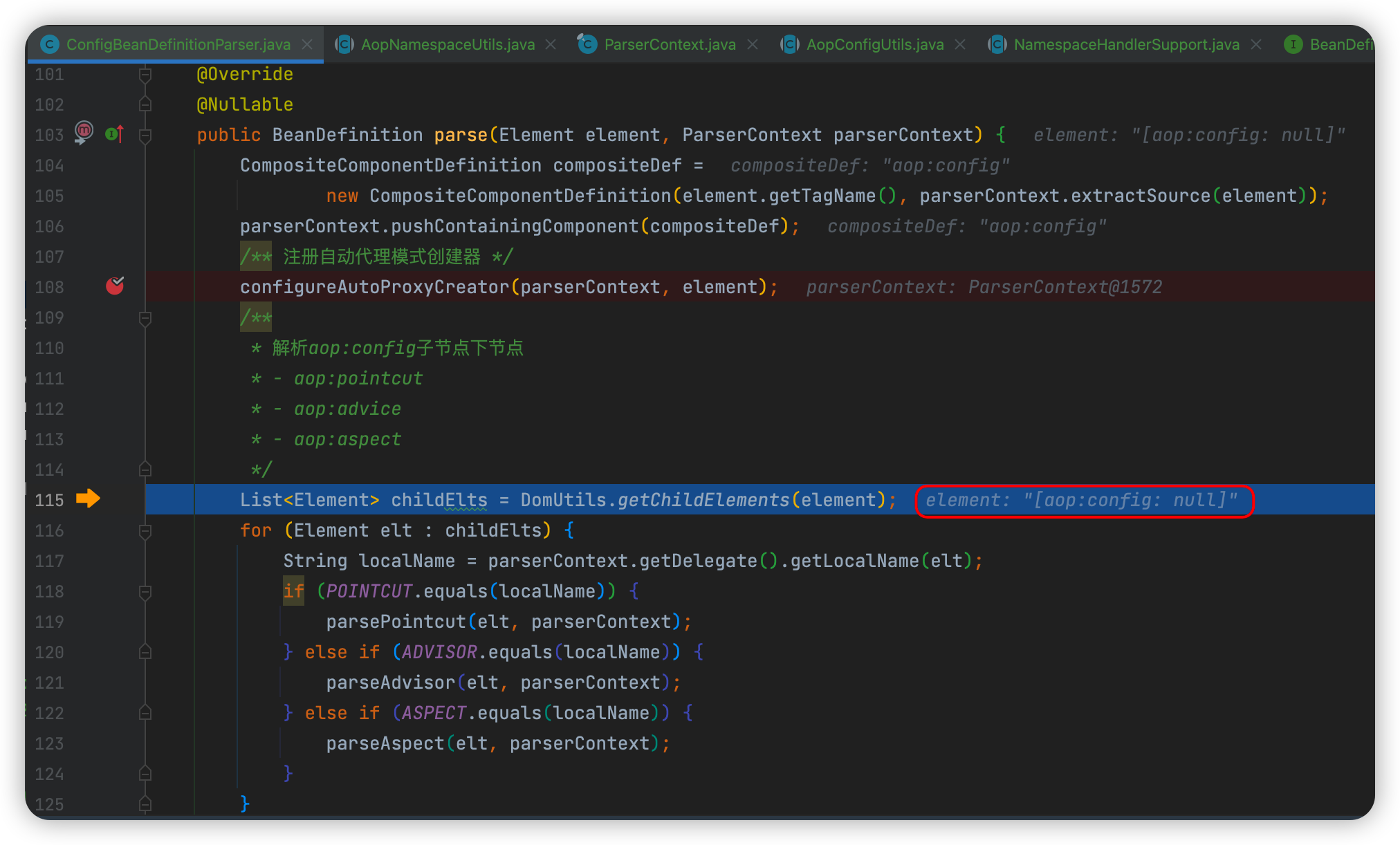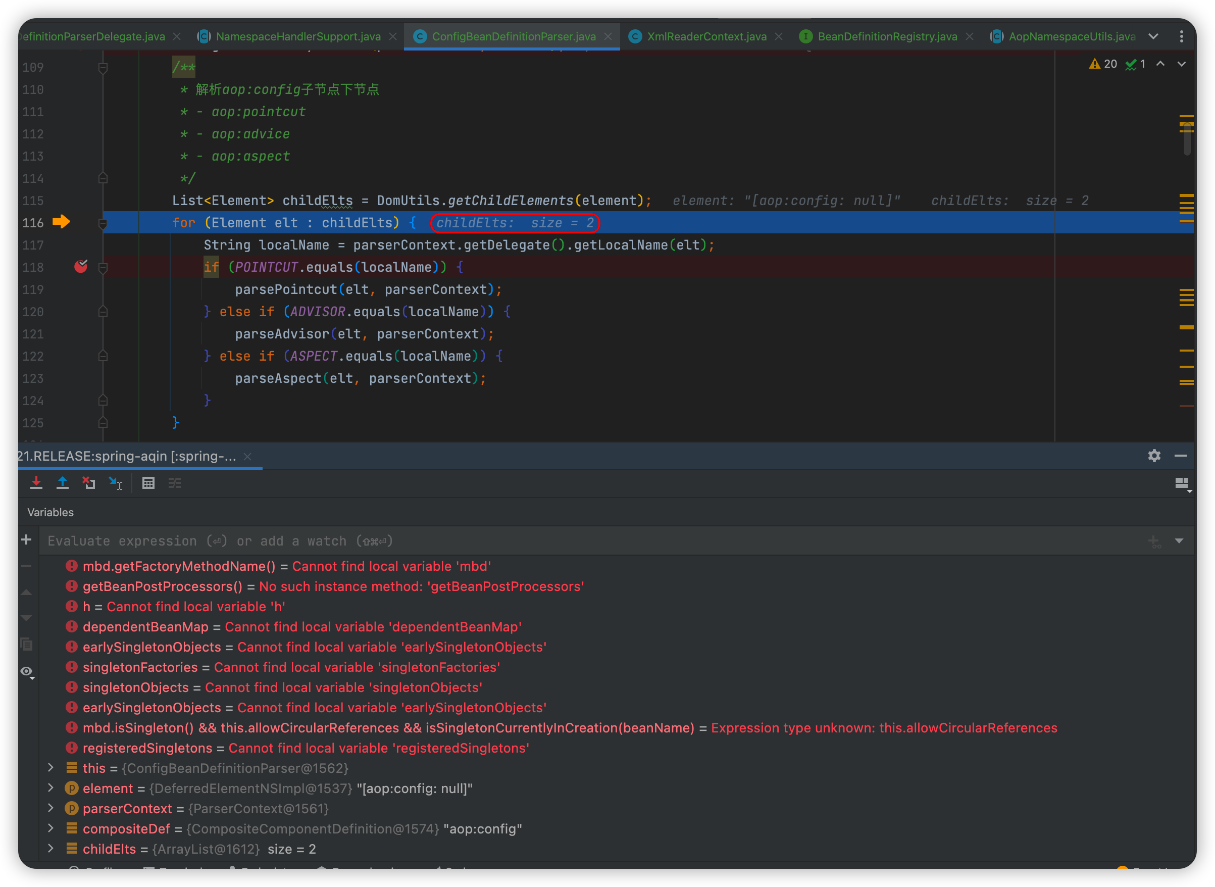 循环结束后,返回到parse()方法中,由于我在XML配置文件(如下图)中加了两个aspect标签🏷️,所以childElts里有两个Element,于是会再按上面👆得大致流程再执行一遍