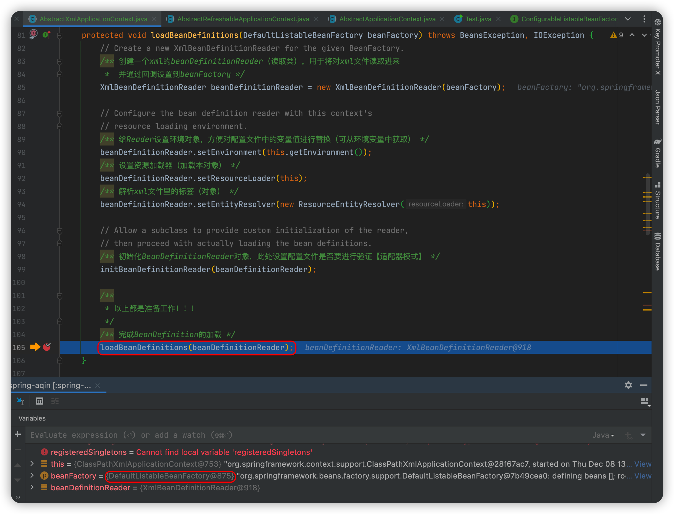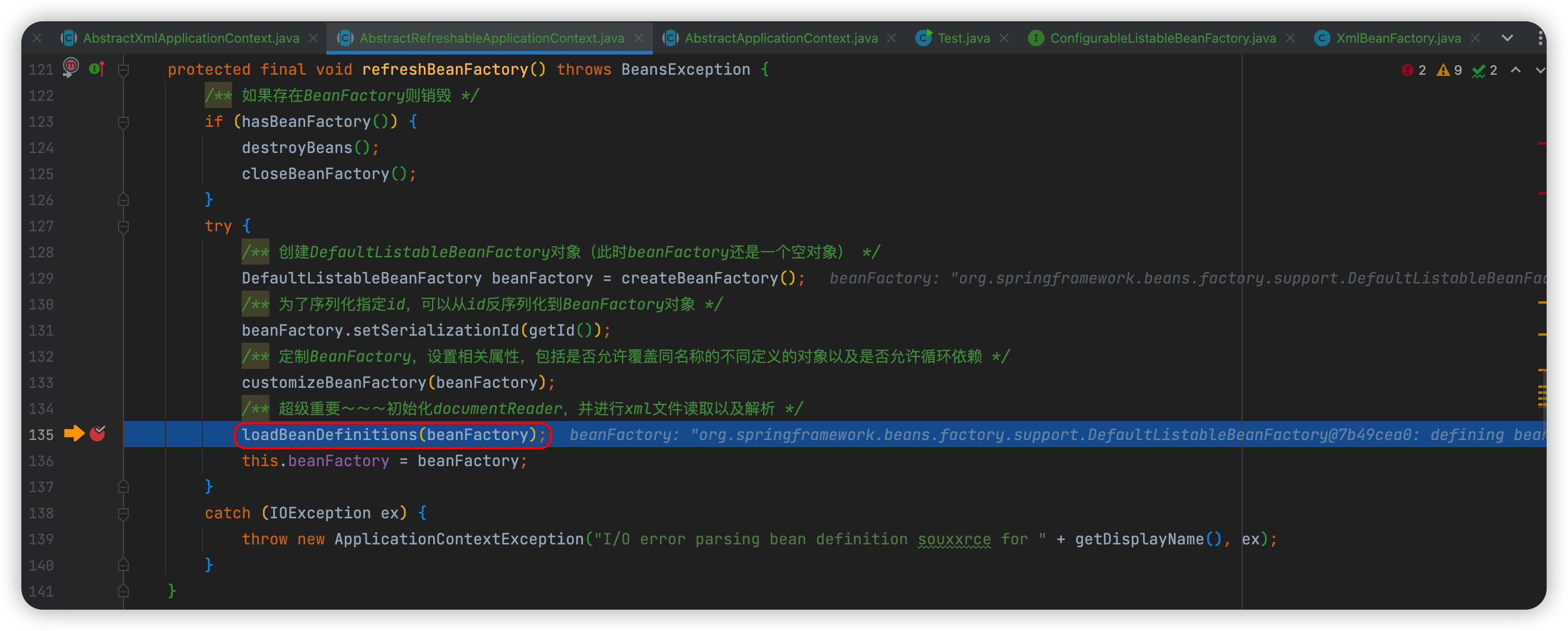 接着进入方法refreshBeanFactory()中,开始BeanFactory的初始化以及XML配置文件的读取和解析