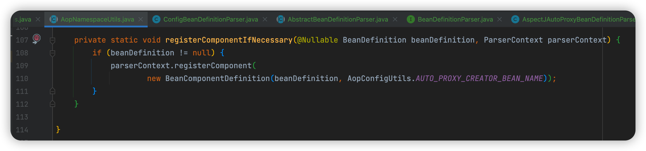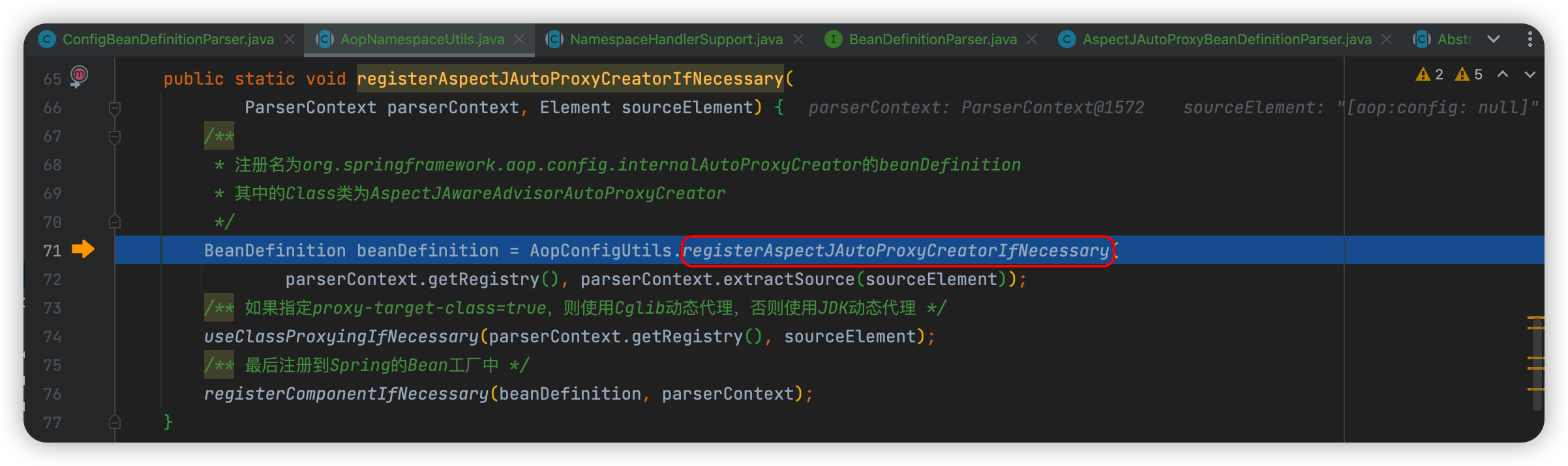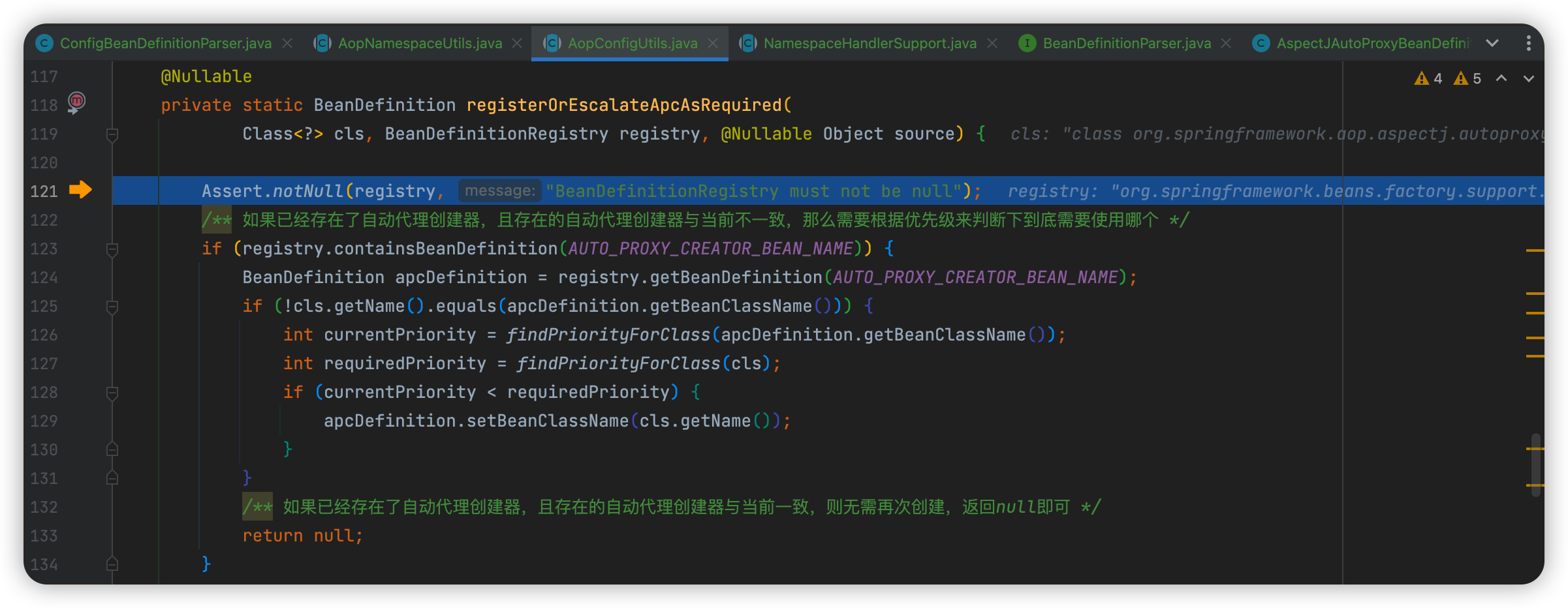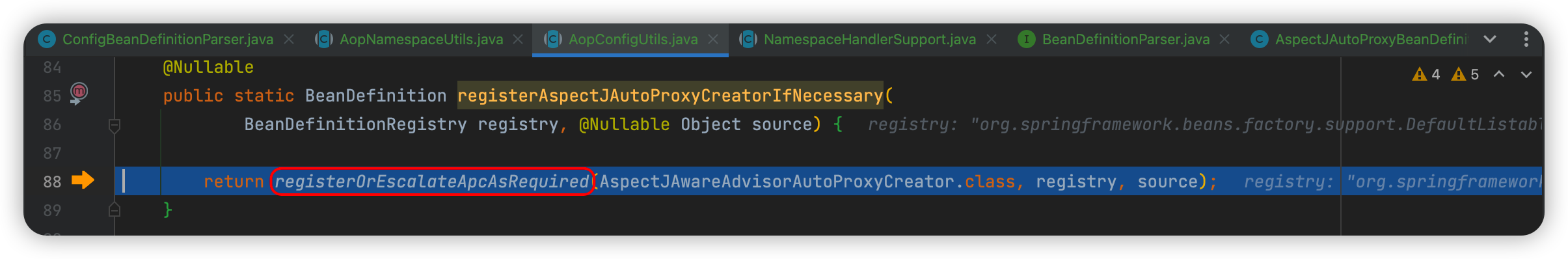 方法registerOrEscalateApcAsRequired()执行到最后的registerBeanDefinition()时,当前的BeanDefinition(也就是AspectJAwareAdvisorAutoProxyCreator的BeanDefinition)就已经注册成功了