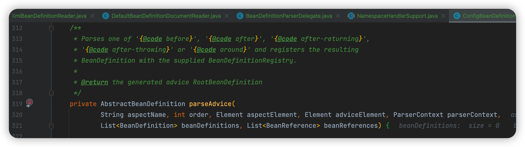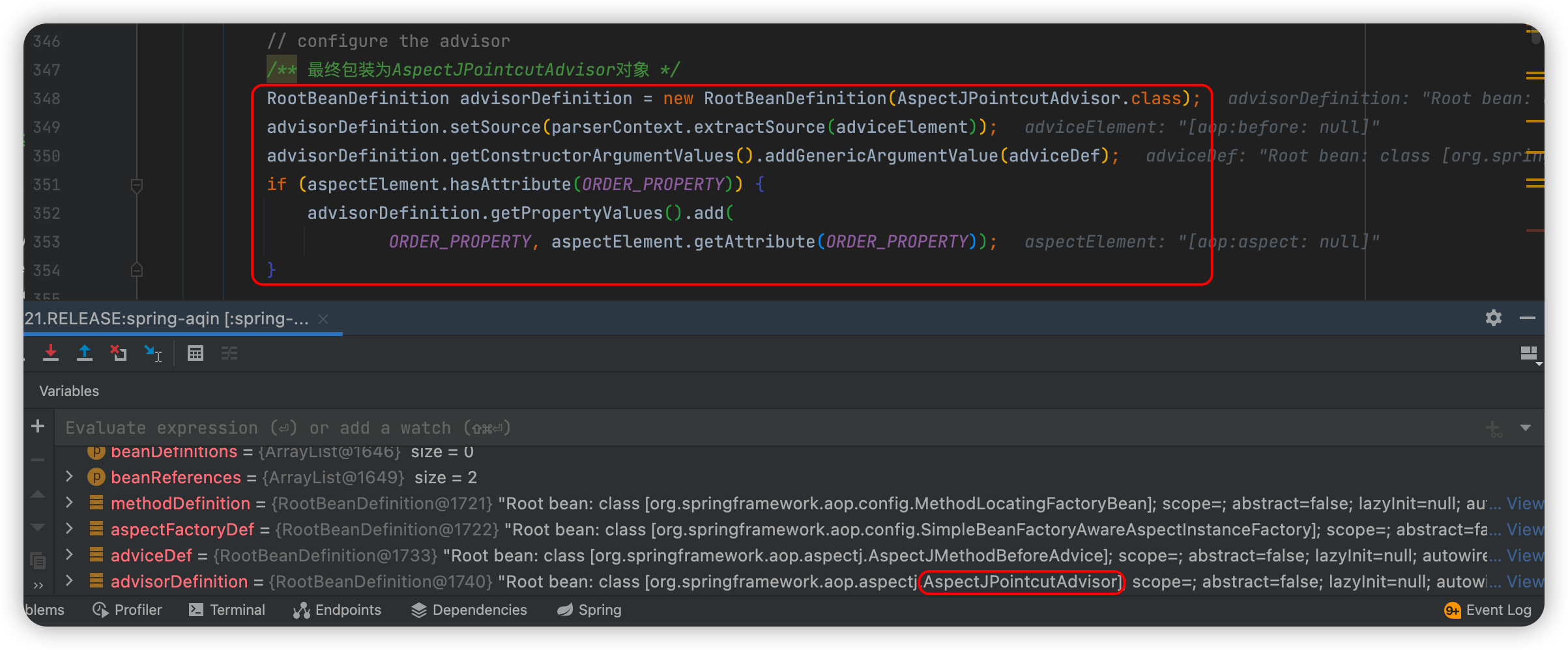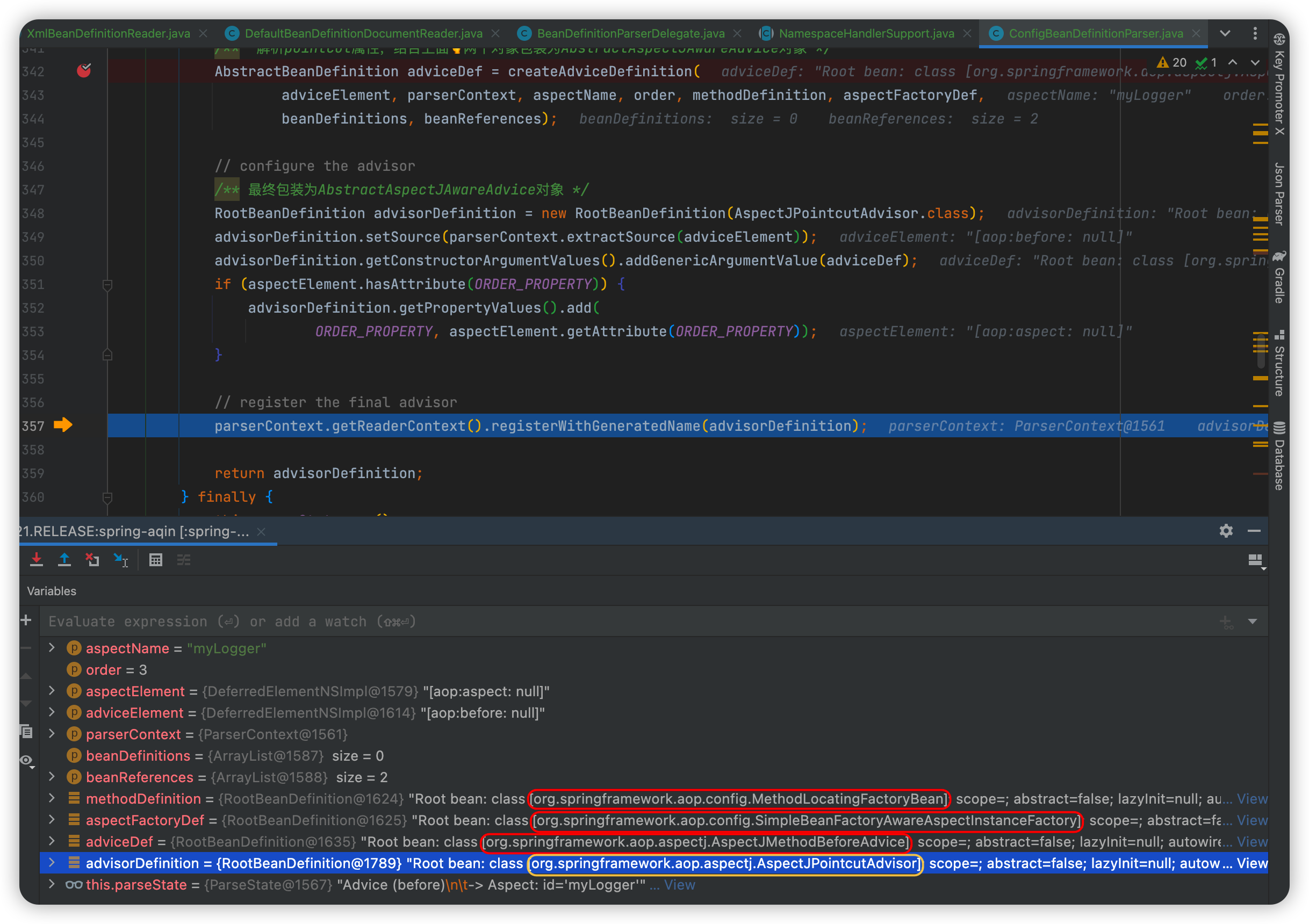 至此,方法createAdviceDefinition()执行结束,返回一个AbstractBeanDefinition类型的对象adviceDef。我们也来回答下介绍方法前的问题:这些生成的RootBeanDefinition对象具体都是哪些类呢?